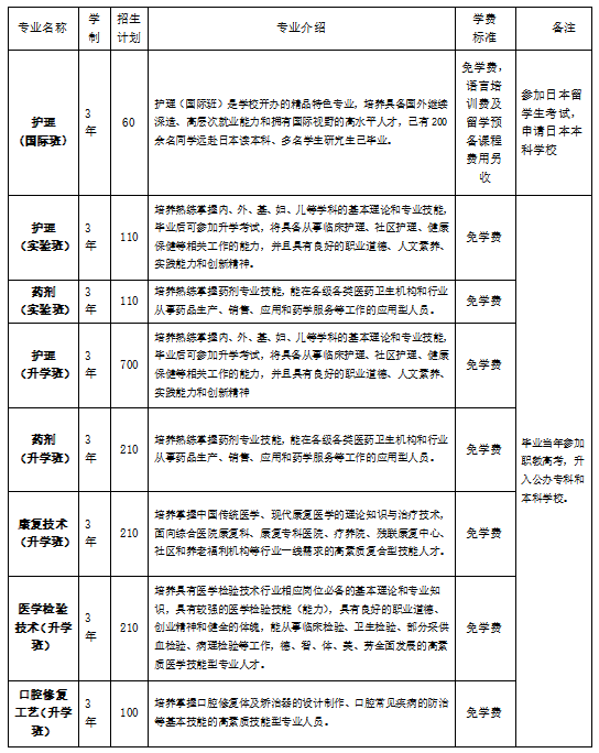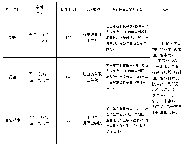 2020年以來,學(xué)校先后與“四川國際標(biāo)榜職業(yè)學(xué)院”“眉山藥科職業(yè)學(xué)院”“雅安職業(yè)技術(shù)學(xué)院”“四川衛(wèi)生康復(fù)職業(yè)學(xué)院”簽訂中高職銜接五年貫通培養(yǎng)聯(lián)合辦學(xué)協(xié)議,學(xué)校招收初、高中畢業(yè)生,主要從事全日制中等職業(yè)學(xué)歷教育,開設(shè)有中高職銜接五年貫通培養(yǎng)護(hù)理、康復(fù)治療技術(shù)、藥劑、醫(yī)學(xué)檢驗(yàn)技術(shù)四個(gè)專業(yè)及三年制護(hù)理(含涉外護(hù)理)、醫(yī)學(xué)檢驗(yàn)技術(shù)、口腔修復(fù)工藝、藥劑、康復(fù)技術(shù)等5個(gè)中專專業(yè)。其中,護(hù)理專業(yè)為教育部首批國家級(jí)示范專業(yè)、四川省中職學(xué)校示范(特色)專業(yè)建設(shè)計(jì)劃第一批立項(xiàng)建設(shè)專業(yè),口腔修復(fù)工藝為四川省重點(diǎn)專業(yè),學(xué)校獲批為首批“1+x”老年照護(hù)證書制度試點(diǎn)院校及“1+x”母嬰護(hù)理、家庭保健按摩、藥物制劑生產(chǎn)考核站點(diǎn)。開展四川省藏區(qū)“9+3”免費(fèi)職業(yè)教育,服務(wù)少數(shù)民族地區(qū)經(jīng)濟(jì)社會(huì)發(fā)展,教育碩果累累,被授予“四川省民族團(tuán)結(jié)進(jìn)步示范集體”。與其他教育機(jī)構(gòu)合作設(shè)立英語護(hù)士班、日語護(hù)士班,累計(jì)培養(yǎng)輸出近500名學(xué)生出國深造或境外就業(yè)。